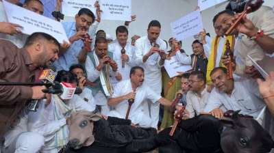 म.प्र. मानसून सत्र में कांग्रेस ने भैंस के सामने बीन बजाकर राजनीतिक प्रदर्शन किया