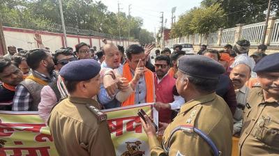 अवैध बूचड़खानों पर कार्रवाई की मांग, पुलिस रोकते ही धरने पर बैठे प्रदर्शनकारी