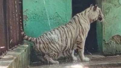गर्मी से राहत: मैत्री बाग जू में शेरों के लिए पानी की बौछार शुरू