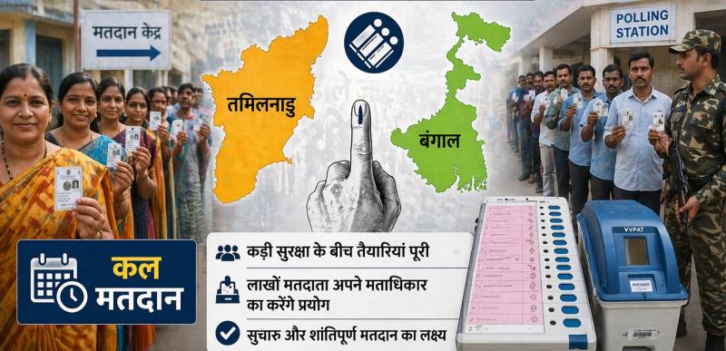 नई दिल्ली: कल गुरुवार, 23 अप्रैल 2026 को होने जा रहे लोकतंत्र के महापर्व के लिए चुनावी बिसात बिछ चुकी है। मंगलवार शाम 5 बजे के साथ ही तमिलनाडु की सभी सीटों और पश्चिम बंगाल के पहले चरण के लिए शोर-शराबा थम गया है। अब उम्मीदवारों की किस्मत का फैसला मतदाताओं के हाथ में है।