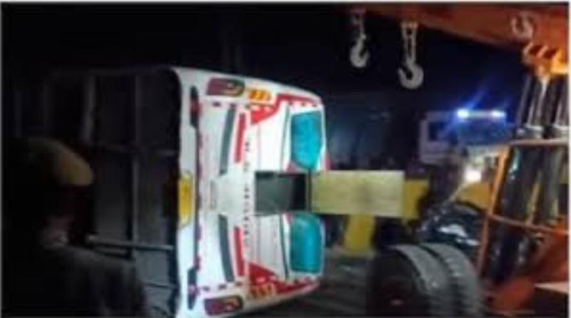 कोटा। राजस्थान की कोटा जिले में देर रात को भीषण सड़क हादसा हो गया। जहां पर फोरलेन पर सवारियों से भरी बस पलट गई। हादसे में तीन लोगों की मौत हो गई। वहीं 12 से अधिक लोग घायल हो गए। जिनको कोटा मेडिकल कॉलेज अस्पताल में भर्ती करवाया गया है। वहीं, हादसे में जान गवा बैठे तीन लोगों के शवों को पोस्टमार्टम रूम में रखवाया गया है। इनमें से दो की पहचान फिलहाल नहीं हो सकी है। यह हादसा शहर के आर के पुरम थाना इलाके में नया गांव पुलिया के पास हुआ।