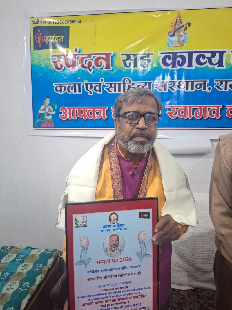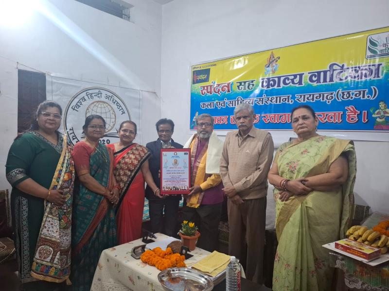 रायगढ़। ख्यातिलब्ध वरिष्ठ साहित्यकार और विश्व हिन्दी अधिष्ठान रायगढ़ छत्तीसगढ़ के सक्रिय सदस्य लिंगम चिरंजीव राव का सम्मान काव्य वाटिका रायगढ़ की संस्था द्वारा गौरव गरिमा के साथ अधिष्ठान कार्यालय में डॉ.आशा मेहर किरण ,डॉ.सुधा देवांगन सुचित्रा संस्थापक के मार्गदर्शन में शाल -श्रीफल और गमले में हरित पौधा भेंट कर किया गया।इस सम्मान के अवसर पर काव्य वाटिका के संस्थापक सदस्य मनोज श्रीवास्तव डॉ.अरविंद सोनी सार्थक,स्वाति पंड्या सहित शहर के साहित्यकार विश्व हिन्दी अधिष्ठान के संस्थापक डॉ.मीनकेतन प्रधान,डॉ.श्रीमती विद्या प्रधान,पंकज रथ शर्मा, श्रीमती रश्मि वर्मा,सोनल मावतवाल श्रीवास आदि की गरिमामयी उपस्थिति थी।