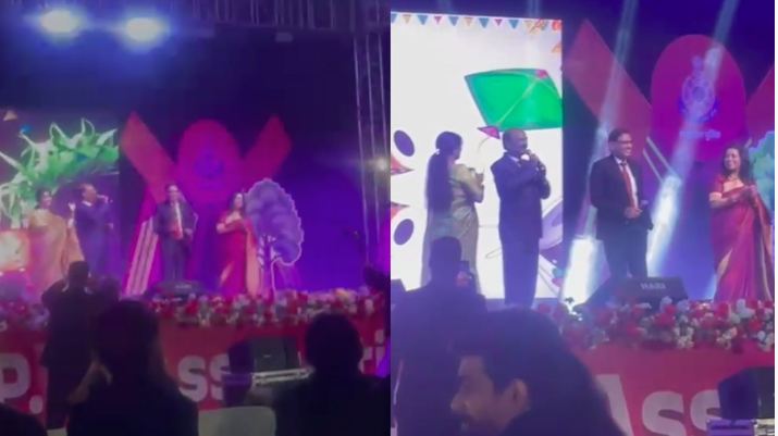 कार्यक्रम के दौरान मंच पर DGP कैलाश मकवाना गदर फ़िल्म के गाने ‘मैं निकला गड्डी… ‘ गाते हुए दिखाई दिए. इस दौरान DGP के साथ उनकी पत्नी भी मंच पर नजर आईं. गाना गाते हुए डीजीपी अपनी पत्नी संग गाने पर थिरकते हुए नज़र आए. DGP कैलाश मकवाना के साथ रिटायर्ड DGP सुधीर सक्सेना भी पत्नी के साथ मंच पर थिरकते नजर आए।