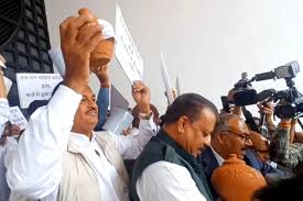 विधानसभा के बाहर खाली गुल्लक के साथ विपक्ष का प्रदर्शन