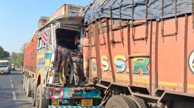 खड़े ट्रक में पीछे जा घुसा दूसरा ट्रक...........क्षतिग्रस्त केबिन से पुलिस ने ड्राइवर को निकाला