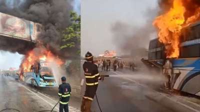 मुंबई-पुणे एक्सप्रेस-वे पर टायर फटने से चलती बस में लगी आग,