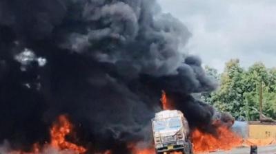 अलकतरा अनलोडिंग के दौरान अचानक भड़की लपटें , स्थानीय लोगों ने दी अग्निशमन विभाग को सूचना